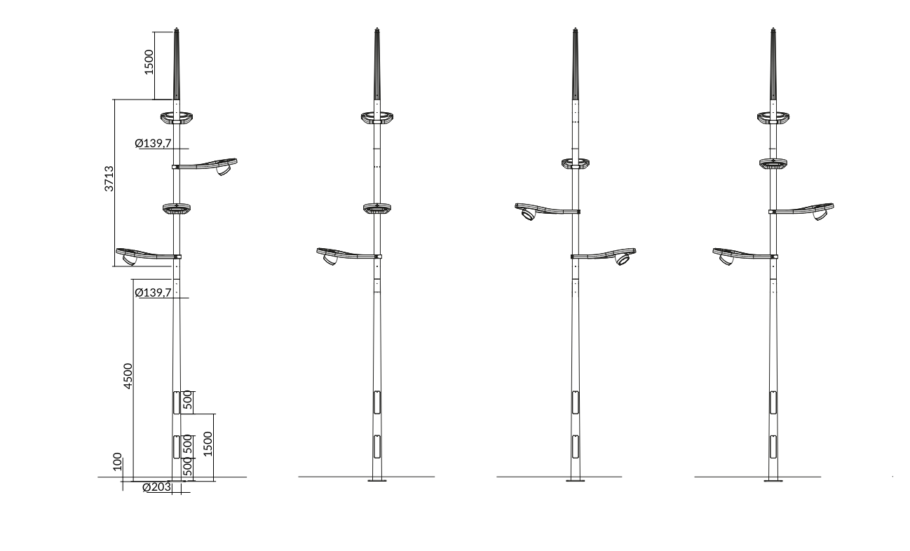 Palo in acciaio composto da una base cilindro conica con un coperchio tubolare in acciaio di diametro 140 mm e un puntale decorativo in acciaio.